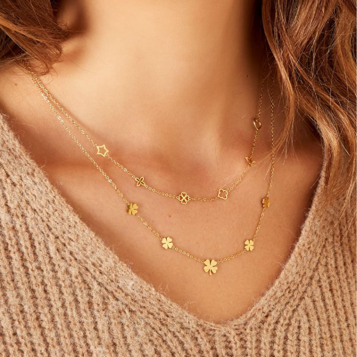 Deze subtiele ketting met kleine figuurtjes, een ster, klavertjes en een hartje, geeft een verfijnde en speelse touch aan je look.